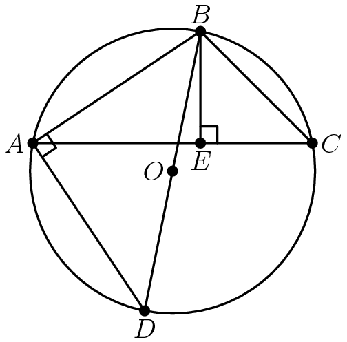 Let AB = c, BC = a, AC = b, BE = h, and BO = R. We know that is a right angle because BD is the diameter. Also,