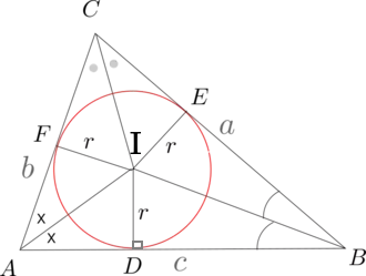 Incircle: The circle inscribed in a triangle is the largest circle contained in the triangle; it touches (or tangent to) the three sides of the triangle. The center of the incircle is called the incenter and the radius of the incircle is called inradius and it is denoted by 'r'.