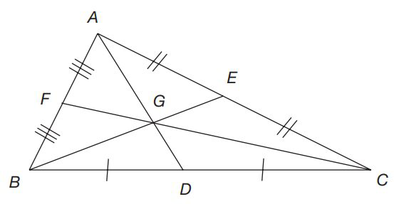 Centroid: The medians of a triangle are concurrent and the point of concurrence of the medians of a triangle is called the centroid and it is usually denoted by G. The centroid divides each of the medians in the ratio 2 : 1, i.e., in the figure given below, AG : GD = BG : GE = CG : GF = 2 : 1.